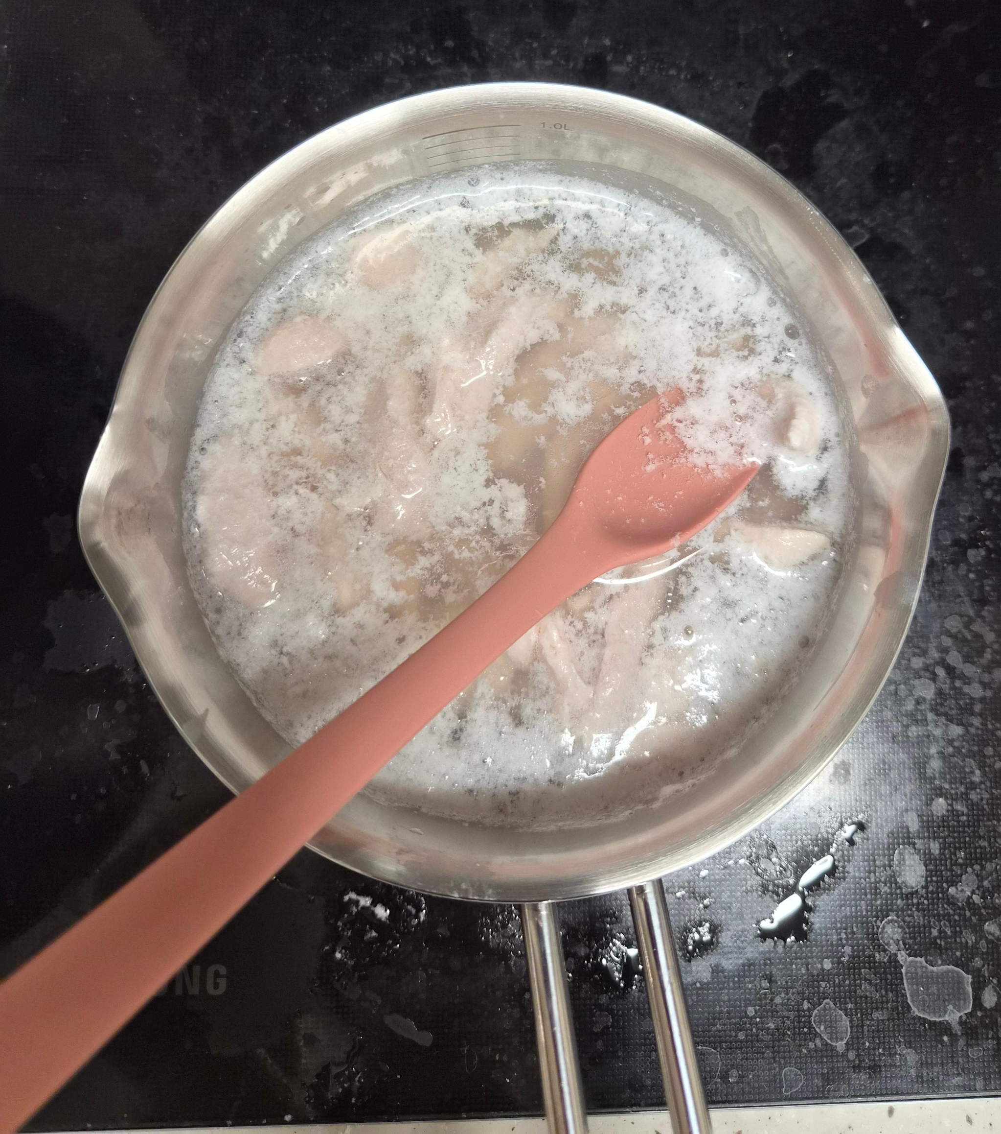 삶는 동안 위에 거품이 뜨면 계속